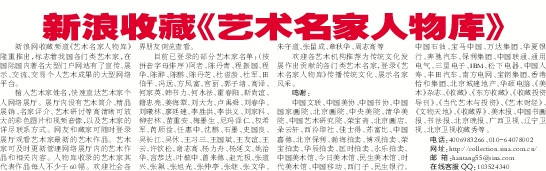 新浪网收藏频道《艺术名家人物库》隆重推出,标志着我国各门类艺术家,在国际国内著名大型门户网站有了宣传、展示、交流、交易个人艺术成果的大型网络平台。