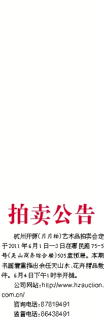 杭州开源(月月拍)艺术品拍卖会定于2011年6月1日—3日在惠民路75-5号(吴山商务综合楼)505室预展。本期书画着重推出余任天山水、花卉精品数件。6月4日下午1时半开槌。