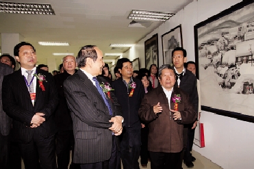 于志学向全国政协副主席阿不来提先生、中央党校副校长陈宝生等领导介绍作品
