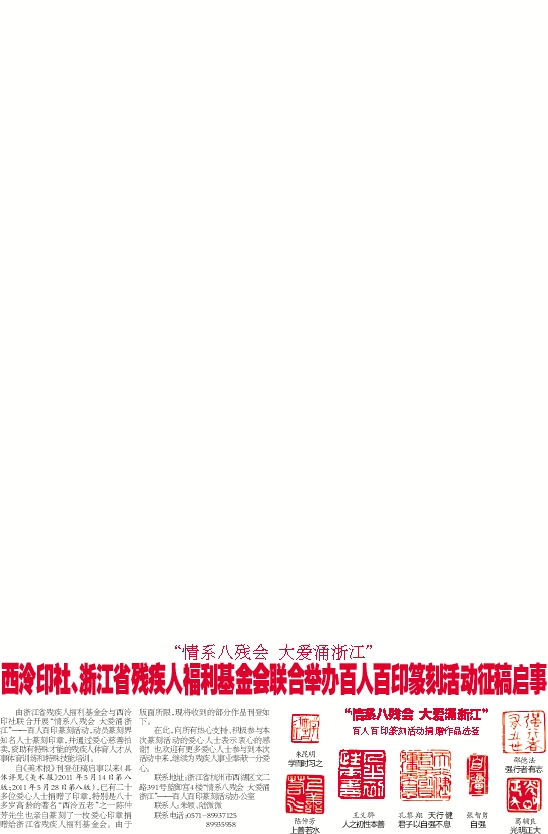 联系地址:浙江省杭州市西湖区文二路391号蓝御宫4楼“情系八残会 大爱涌浙江”——百人百印篆刻活动办公室
