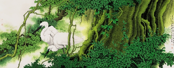崔志安 老林润白鹭 纸本设色 144×368cm 2011年