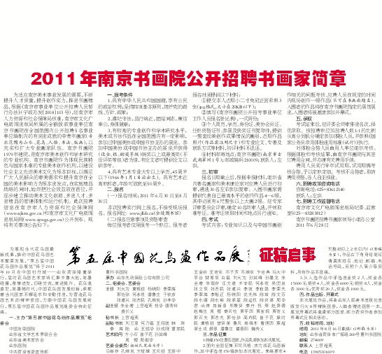 为适应南京美术事业发展的需要,不断提升人才质量,提升创作实力,推出书画精品,根据《南京市事业单位公开招聘人员暂行办法》(宁政办发〔2008〕103号),经南京市人力资源和社会保障局核准,南京市文化广电新闻出版局所属的全额拨款事业单位南京书画院在全国范围内公开招聘5名事业单位编制内的有突出成就的中青年画家(专业范围为山水、花鸟、人物、书法、版画),以充实和扩大专业画家队伍。南京书画院1979年建院,是南京市美术创作和学术研究的专业机构。南京书画院作为体现民族特色与国家水准的专业美术创作机构,以建设社会主义先进美术文化为根本目标,以满足广大人民群众的审美需求和提升南京在全国的美术影响力为根本出发点,在实施精品战略的同时,始终把社会效益放在首位,并逐步建立推动美术文化创新、多出人才、多出精品的管理体制和运行机制。此次招聘信息在南京市人力资源和社会保障网(www.njhrss.gov.cn)和南京市文化广电新闻出版局网(www.njwgx.gov.cn)公开发布。现将有关事项公告如下: