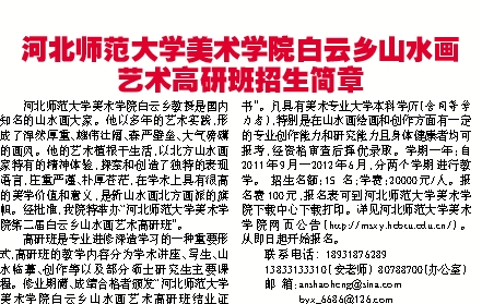 高研班是专业进修深造学习的一种重要形式,高研班的教学内容分为学术讲座、写生、山水临摹、创作等以及部分硕士研究生主要课程。修业期满、成绩合格者颁发“河北师范大学美术学院白云乡山水画艺术高研班结业证书”。凡具有美术专业大学本科学历(含同等学力者),特别是在山水画绘画和创作方面有一定的专业创作能力和研究能力且身体健康者均可报考,经资格审查后择优录取。学期一年:自2011年9月—2012年6月,分两个学期进行教学。 招生名额:15 名;学费:20000元/人。报名费100元,报名表可到河北师范大学美术学院下载中心下载打印。详见河北师范大学美术学院网页公告(http://msxy.hebtu.edu.cn/)。 从即日起开始报名。