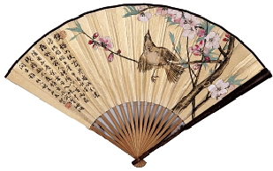 陆抑非、杨千里 桃花鸣禽·书法 设色金笺 成扇 19×50cm