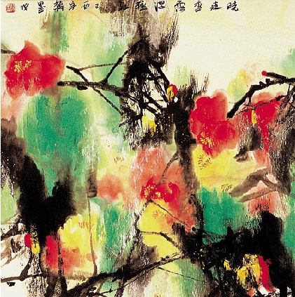 韩墨 晓来重露湿轻红 68×68cm 宣纸、墨、国画色、丙烯 2005年