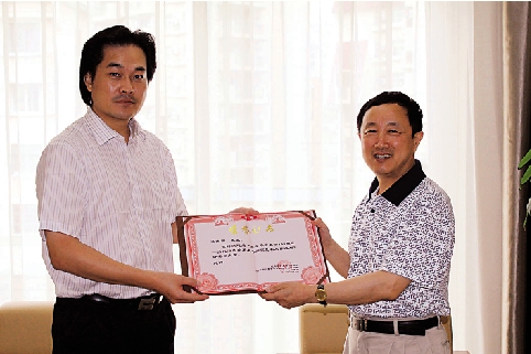 组委会主席、华夏国际商会许峰会长向汤沐黎颁发评审委员会主席证书