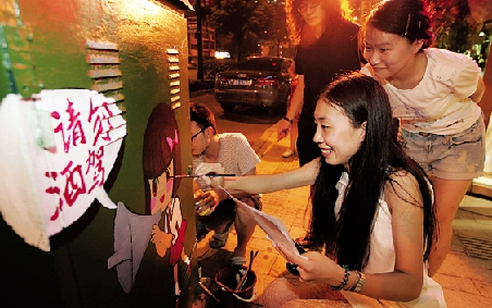 晚上7点半,朱慧正在给环城西路上的一只变电箱“上妆”。