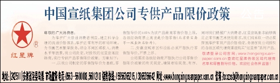 公司要求各级经销商严格执行公司零售价格限价政策的有关规定,确保市场规范、有序。同时我们提醒广大消费者,红星宣纸基本能够满足正常书画艺术使用需求,我们将采取一切必要措施维护常规产品价格稳定,务请在我公司授权的各级区域代理商渠道购买“红星牌”系列产品。