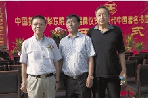 中囯美术院华东院院长兼秘书长赵忠祥(中)与中共中央监察委员会原副书记刘澜涛之子、武警总部原大校刘冀燕(左),开囯上将肖克之子、武警总部原纪委书记、少将肖星华(右)在开幕式上。