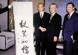 邵华泽访问日本时向村山富市首相赠送书法作品《杖莫如信》(1995年11月)