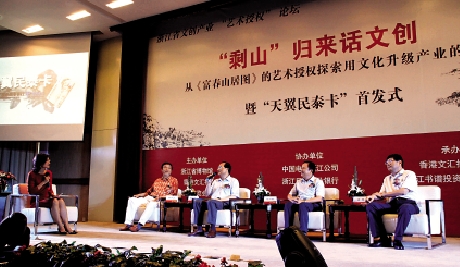 浙江省文创“艺术授权”论坛现场,依次是董倩、何水法、杨建新、舒国增、胡坚