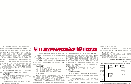 为了贯彻落实全国教育工作会议和《中共中央、国务院关于深化教育改革全面推进素质教育的决定》的精神,在成功举办历届全国师生优秀美术作品评选活动基础上,在教育部艺术教育委员会、中国教育学会、中国美术家协会、中国书法家协会、全国少工委等有关部门领导的关心、支持和帮助下已成功地举办了10届,受到了教育部及有关部门的高度评价和社会各界的热情关注,已成为我国艺术教育领域中较高规格的活动之一。由中国教育报刊社、中国老摄影家协会主办,清华大学美术学院协办,中国老摄影家协会信息中心承办的第十一届全国师生优秀美术作品评选活动现面向全国征稿,评选活动将继续按历届程序进行。具体事宜如下: