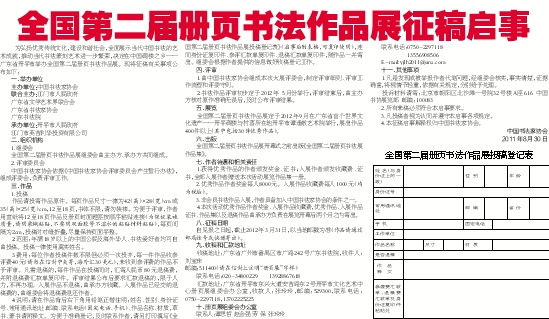 全国第二届册页书法作品展定于2012年9月在广东省首个世界文化遗产——开平碉楼与村落所在地开平市谭逢敬艺术院举行,展出作品400件以上(其中包括30件优秀作品)。