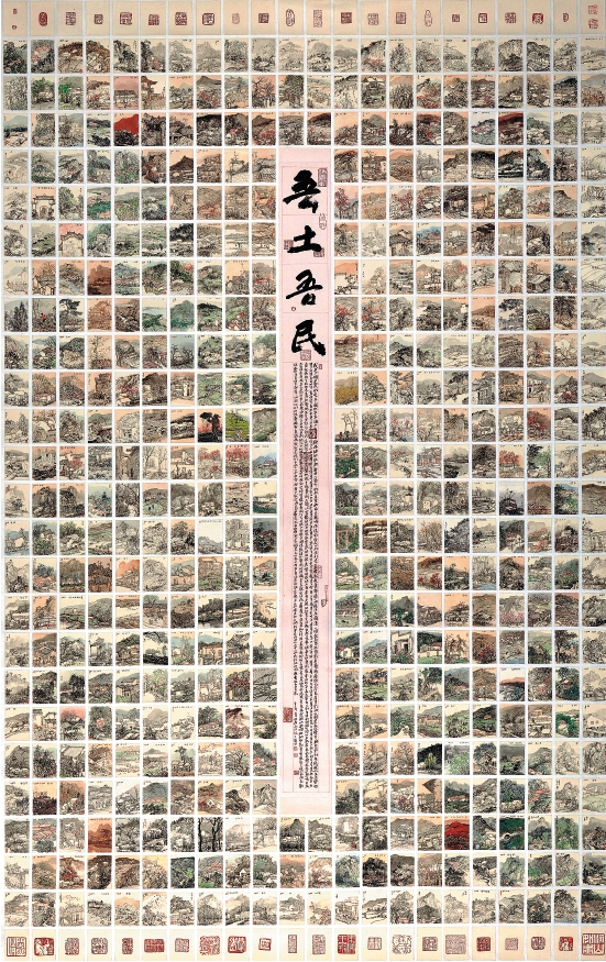 徐国雄 吾土吾民 199×126cm 以492张规格为5×7cm的山水写生作品,再加上上下两排44张闲章,共计用了536张小作品。
