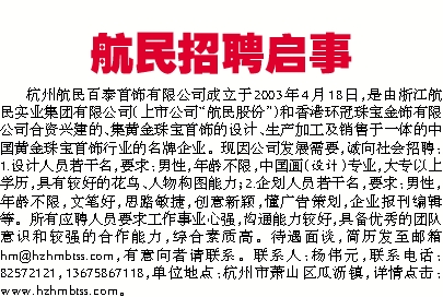 杭州航民百泰首饰有限公司成立于2003年4月18日,是由浙江航民实业集团有限公司(上市公司“航民股份”)和香港环冠珠宝金饰有限公司合资兴建的、集黄金珠宝首饰的设计、生产加工及销售于一体的中国黄金珠宝首饰行业的名牌企业。现因公司发展需要,诚向社会招聘:1.设计人员若干名,要求:男性,年龄不限,中国画(设计)专业,大专以上学历,具有较好的花鸟、人物构图能力;2.企划人员若干名,要求:男性,年龄不限,文笔好,思路敏捷,创意新颖,懂广告策划,企业报刊编辑等。所有应聘人员要求工作事业心强,沟通能力较好,具备优秀的团队意识和较强的合作能力,综合素质高。待遇面谈,简历发至邮箱hm@hzhmbtss.com,有意向者请联系。联系人:杨伟元,联系电话:82572121,13675867118,单位地点:杭州市萧山区瓜沥镇,详情点击:www.hzhmbtss.com。