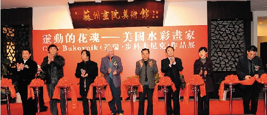 江苏省委宣传部文艺处处长李朝润先生,江苏省美术家协会副主席、苏州美术家协会副主席徐惠泉先生,苏州市人民政府外事办公室副主任陈羔先生,苏州工业园区社会事业局副局长何雯女士,苏州工艺美术学院院长廖军先生,中央新影《中国当代画家》编委会主编杨晓明和苏州画院院长沈威峰先生为画展剪彩