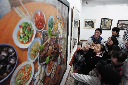 ▼汪文斌老师的作品《家有喜事》中,一桌丰盛的家宴栩栩如生,看得学生们垂涎三尺。