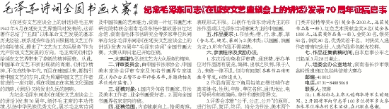 为纪念毛泽东同志《在延安文艺座谈会上的讲话》发表70周年,缅怀毛主席的丰功伟绩,弘扬中华民族优秀文化,展示毛主席诗词及中国书画的艺术魅力,湖南一片红书画艺术研究院特联合湖南毛泽东杨开慧故居旧址纪念馆、湖南省毛体书法研究会等多家单位共同举办纪念毛泽东同志《在延安文艺座谈会上的讲话》发表70周年“毛泽东诗词”全国书画大赛。大赛从即日起已开始征稿。