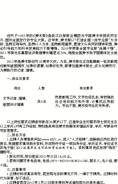 2013年是美术报创刊20周年大庆。为此,美术报社正在酝酿新一轮的新闻创新和版面调改,如果你愿意,如果你优秀,敬请加盟美术报社,成为与美同行、为美践行的记者、编辑。