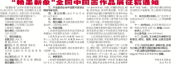 “翰墨新象”全国中国画作品展主题词:海上百年、世纪丹青,弘扬现实主义创作精神,关注民生、关爱自然、传承创新。现将此次展览的有关事宜通知如下: