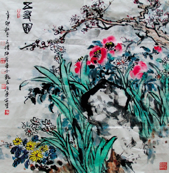 西泠五老合作 五友图(钱大礼画茶花,陈仲芳画水仙,郁重今画菊花,林乾良画石头,丁茂鲁画梅花)