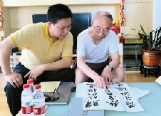 江军(左),承泰堂主人,号平原山人,系浙江省青年书法家协会会员、江西省硬笔书法家协会理事。生于江西永兴,现工作生活于嘉兴。