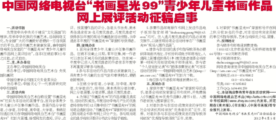 七、本征稿启事将常年在本活动官网——中国网络电视台艺术台(http://arts.cntv.cn)和中华校园网(www.zhxyzx.com)内发布,并定期在《美术报》、《书法报》、《中国书画报》等专业报刊上发布。