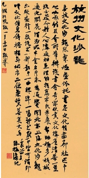 | 杭州文化沙龙 66×33cm 吾杭文化沙龙风气极盛。依托书店、文化馆、画廊、社区中心、咖啡馆及会所举办读书会、音乐欣赏、文化讲座。清茶一盏, 说古道今, 于人心沟通, 相互理解, 提高市民素养, 帮助极多。杭城遍地开花, 谓为城市金名片, 未为过誉。闻北京上海文化沙龙亦颇盛行。一段说书、一部影片、一曲评弹、一场新书发布会, 皆可谓即时文化信息传播, 提升城市品位气质, 善莫大焉。 壬辰前夜, 陈振濂记。 见《钱江晚报》1月14日报道。 |