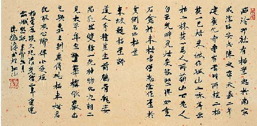 | 释文: 西泠印社有柏堂,起于南宋。咸淳《临安志》:陈文帝天嘉二年,建广化寺,寺有当时所植二柏,其一已枯。东坡作《孤山二咏序》云:柏二株,其一为人所薪,山下老人自云儿时见枯矣,然坚悍如金石,愈于未枯者。僧志诠作堂于其侧,名曰柏堂。 《东坡题柏堂诗》:道人手种其生前,鹤骨龙姿尚宛然。双干一先神物化,九朝三见太平年。忽惊华构依岩出,乞与嘉名到处传。此柏未枯君记取,灰心聊伴小乘禅。柏堂原迹久圮,清光绪二年重建,俞樾题额。辛卯六月,陈振濂书于孤山。 |