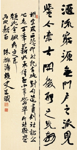 胡宗成《西泠印社记》有此对句,道尽创社诸公心志,百年薪火承传无不奉此为准,印社兴盛赖此金针鼎定耳。丙戌新正,陈振濂读史并识。