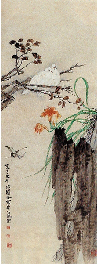 张大千、张善孖、于非闇合作 白鸠花卉