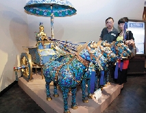 国内首座景泰蓝博物馆于6月6日在位于北京市东城区永定门外安乐林路10号的北京市珐琅厂有限责任公司开馆。这座博物馆馆藏展品以元明清时期制作风格的珐琅器(景泰蓝)为主,同时陈设有该厂自建厂以来各时期的景泰蓝精品及多位大师、老艺人的经典作品。图为观众在景泰蓝博物馆观看景泰蓝工艺品《兵马战车》。 赵冰 摄 |