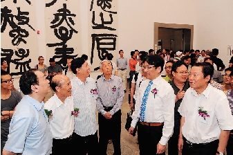 中国书协主席张海(中)等在开幕式现场参观。