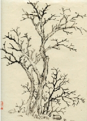 图3:张伟平课徒稿。画树出枝,一忌干、枝均等排列;二忌数枝平行;三须注意枝要抱体,不可散乱。此图是以中枝为主的(鹿角枝)树法,用笔肯定,以中锋为主,显得树体枝干很有力量。