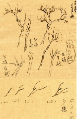 图2:张伟平课徒稿。鹿角枝出枝示意图,从(一)至(四)为出枝次序,其他图稿标明分枝时勾勒用笔的注意点。