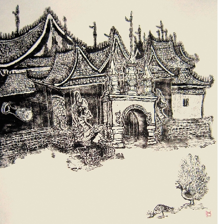 河岛富士子 大庙 油性木版画 96.5×95.8cm