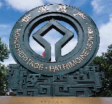 | 7月2日,西湖世界遗产标志揭幕暨庆祝西湖成功申遗一周年仪式在杭州涌金广场举行。西湖世界遗产标志雕塑主材为青铜,重约4吨,高4.24米,主体部分呈圆形,直径3.73米,雕刻有“世界遗产”四个大字及世界遗产徽标。 龙巍 摄 |
