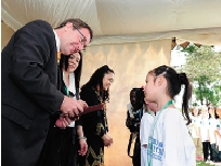 7月16日,在肯尼亚首都内罗毕的联合国环境规划署总部,联合国副秘书长、环境规划署执行主任阿齐姆·施泰纳(左一)向“2012中国儿童环保教育计划”环保绘画大赛20名获奖的“中国小画家”颁发了荣誉证书。据活动主办方环境规划署介绍,今年绘画大赛的主题是“我心目中的绿色家园”。活动收到来自北京、沈阳、西安、成都等地小朋友的参赛画作62万幅,又一次刷新了大赛纪录。 丁海涛 摄 |