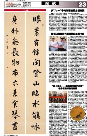 本报北京讯 彭一超 在中国人民解放军建军85周年来临之际,北京市西城区文化委员会于7月26日至8月6日,在该区文化中心举办了中南海警卫战士首届书画展。共展出书法家吴艳萍、戚道顺、郭永琰、王晓晖、杨陌、武中梁、刘原,以及画家张进跃、侯卫东、李振军、王德平、王立国、沙洪洲、康邕、窦鸿山、田俊杰共16位艺术家精心创作的50余幅书画作品。作品从不同侧面讴歌了党领导人民军队走过的战斗历程和取得的辉煌成就,表达了中南海警卫战士永远忠于党,誓死保卫党中央和中央领导同志的豪迈情怀。