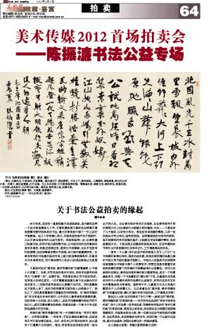 据业内人士称,这次拍卖创了好几个第一:新成立的“美术报·美术传媒拍卖”的首场拍卖……当代有专业品质的“首场书法专场拍卖”,我个人平生第一场专场拍卖,有清晰学术理念即“学术引领拍卖”的首场拍卖,既有这么多说法,我自然会迫切希望它能取得圆满成功,并诚恳地告诉大家,每一位参与这场书法拍卖的收藏界、企业界朋友,其实都是在与我合作、共同打造一个公益文化品牌,是为社会服务、体现社会责任的一种具体表现。