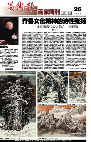 为了进一步追求艺术梦想,50岁后的他毅然放弃了省城舒适优越的工作生活环境,以优异成绩考取了中国艺术研究院研究生院冰雪画工作室研究生课程班,开始走进冰雪画派,对冰雪画进行系统全面的研究。因他版画、油画、水彩画、插图及书法的深厚艺术积淀,使他具有一种包容和吸收各种优秀艺术语言的广阔胸怀,较快理解并融入了冰雪画创作状态之中一发而不可收。他善于综合各门类艺术之长,柔韧有余地将他在版画方面的专业积淀与冰雪画技法进行对接,使他在构图和画面黑、白、灰关系及细部处理上都有自己的独到之处,形成了自己冰雪画语言符号,无论是雪山、雪梅、雪竹还是杂树,都画得得心应手。而最能代表珂钧冰雪画艺术风格的还当属他的松柏系列。他钟情于曲阜孔府、孔林、少昊陵的松柏。松柏长青,“岁寒,然后知松柏之后凋也”,寄寓了文人坚韧忠贞的高贵气节和品格,也是他自身历尽艰辛一步步走来的人生见证。他的矾墨松柏系列,将西画技法融入冰雪画技法之中,画面上由矾墨形成的一条条缜密的细白线条如同工笔的黑线,造成媲美版画和油画的强烈视觉效果。他用厚重豪放的笔触展现了古柏盘根虬干峻拔雄奇的繁密倔强的躯干,行笔苍劲、骨脉强雄,浑然凝重,恣肆挥洒,揭示了古柏饱经沧桑的生命本质和气势高古的阳刚之气。这些精微的肌理若不用矾墨语言依传统中国画技法难以表现,透着画者技法的高超和难度,甚至有一种不真实之感,但又是那样亲切质朴,以至于令人产生一种抚摸的冲动。从画面里不难看出他有着太多难以忘怀的情感记忆,通过冰雪古柏的形式美、笔墨美、点线的交错和明暗虚实的变化赋予的拟人化人文品格。既吸收了西洋画法之长,还有中国画笔墨传神的情调,又有冰雪画矾墨语言夺目鲜明的独特魅力,且进一步突破了传统冰雪画的语言模式,形成了具有自己艺术风格的矾墨语言,而成为冰雪画派代表人物。