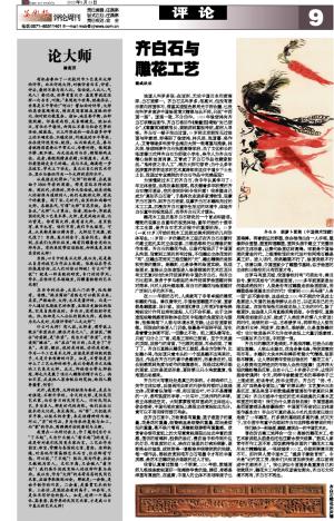 雕花木工经历是齐白石研究的一个盲点和弱项。精致的观察出自童年的视觉体验,童年开始的十数年木工生涯,是齐白石艺术历程中的重要阶段。15岁(一说12岁)开始的粗木工远胜过美术院校的几何形体写生,16岁到27岁的雕花木工经历在齐白石启蒙时代建立起扎实的立体观察、三维思维和无比精湛的制作本领。齐白石的雕花作品,以凿代笔经历了中国画从构图、写意到工笔的所有过程,不但雕出立体花饰的“有”,还雕出花饰间三维空隙的“无”,雕出精美的局部和完美的整体。是雕刻,也是珍贵的绘画实践。纵观绘画史,直接从立体造型进入绘画领域的艺术巨匠只有文艺复兴时的米开朗琪罗和中国的齐白石。和齐白石比起来,服务于罗马教廷的米开朗琪罗绘画题材相对简单,只对人体兴趣浓厚,而白石的雕花与绘画题材广泛到几乎无所不包。