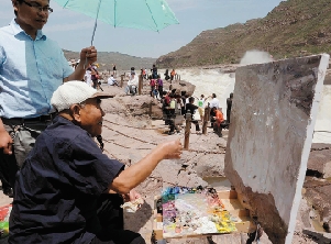 84岁的勒之林先生对着壶口瀑布现场油画写生,颇见功力