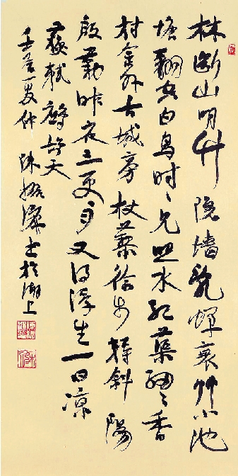 释文:林断山明竹隐墙,乱蝉衰草小池塘。翻空白鸟时时见,照水红蕖细细香。村舍外,古城旁,杖藜徐步转斜阳。殷勤昨夜三更雨,又得浮生一日凉。