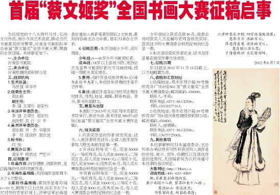 为迎接党的十八大胜利召开,弘扬文化传统,展示书法艺术成就,推动当代书画篆刻市场繁荣,河南省书画院拟举办首届“蔡文姬奖”全国书画大赛,现面向全国征稿。具体事宜如下: