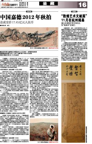 中国嘉德2012秋拍经过为期4天拍卖,于10月31日在北京圆满收槌,中国书画、瓷器家具工艺品、油画雕塑、古籍善本、名表珠宝翡翠门类总成交额17.45亿元人民币。中国嘉德国际拍卖有限公司董事总裁王雁南女士接受采访时表示:公司为适应市场形势和藏家需求,此次秋拍精心设计征集了多个主题专场,得到市场热烈回应。市场表现稳定,成交结果符合预期。