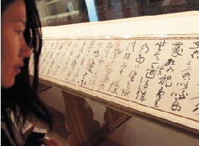 | 11月1日,一位观众在观看北宋黄庭坚的书法巨作《草书廉颇蔺相如列传卷》。 当日,“翰墨荟萃——美国收藏中国五代宋元书画珍品展”在上博揭幕。此次展览首次将美国大都会艺术博物馆、波士顿美术馆、纳尔逊艺术博物馆和克利夫兰美术馆所藏的中国古代书画珍品聚集到一起,共计60件展品,涵盖五代、宋、元400多年时间跨度。 新华社记者 任珑/摄 |