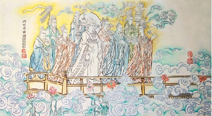 朱戴林(浙江杭州) 群仙参佛图(为马来西亚佛教圣地绘制) 壁画