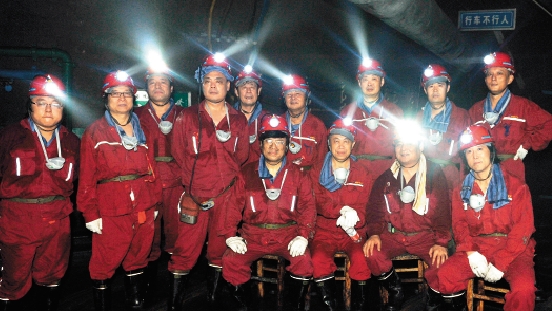 有一位老矿工说:这是俺建矿50年来第一次有画家到井下来看俺们。山东画家在500多米地下矿井合影。