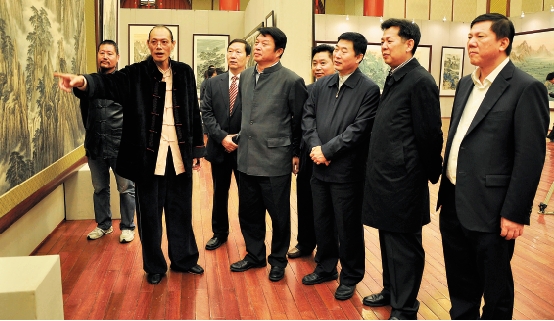 | 中国文联党组副书记、副主席覃志刚(左四),国家发改委书画协会主席、中央国家机关书法家协会副主席王思强(右三)等领导参观画展,听取董希源介绍画展情况 |